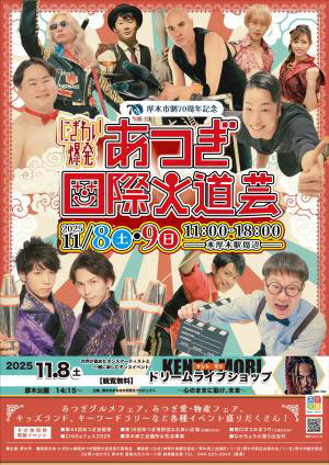 息をのむような曲芸が続く公園を抜けると街角からパントマイムに上がる笑い声が聞こえ、振り向いたあなたの前には、妖怪や巨人が現れる・・・ そして、月明かりの下、静かに幕を開ける”夜会”とは・・・ アツギの空も街もジャックする2日間。いつもと違う厚木のまちで、どうぞごゆっくりお過ごしください!!。