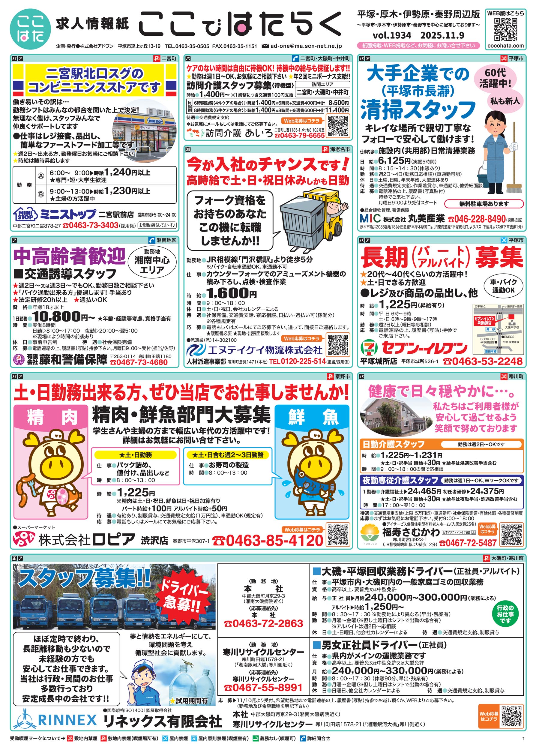 厚木市、伊勢原市 アドワン 厚木伊勢原版 新聞折込チラシの無料求人情報誌 チラシ クチコミを見る・投稿する チラシ 広告有効期限:2025.11.09~2025.11.15 その他のネットチラシ 周辺のチラシを見る このお店のTOPページへ twitter Facebook Google+