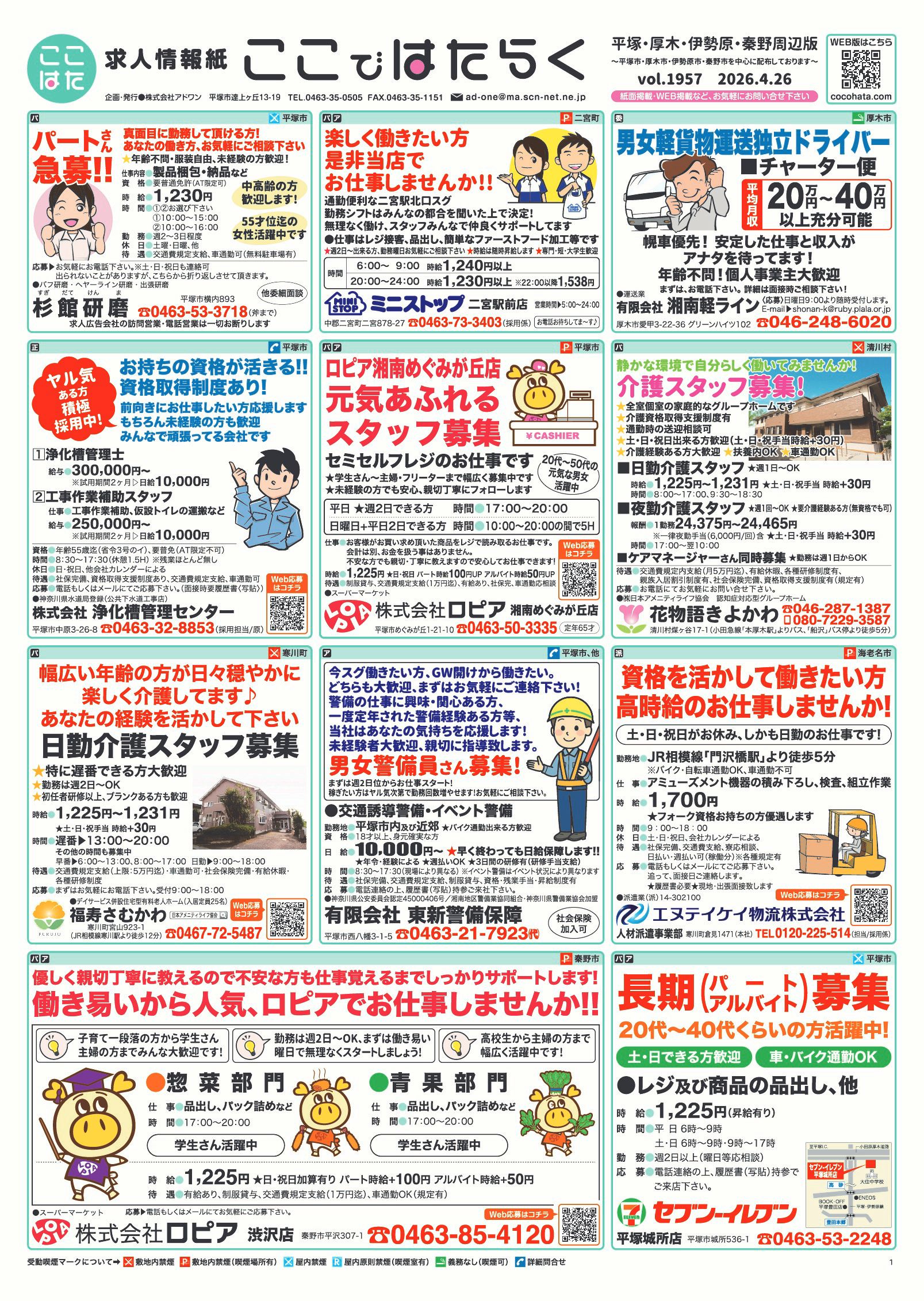 厚木市、伊勢原市 アドワン 厚木伊勢原版 新聞折込チラシの無料求人情報誌 チラシ クチコミを見る・投稿する チラシ 広告有効期限:2026.04.26~2026.05.02 その他のネットチラシ 周辺のチラシを見る このお店のTOPページへ twitter Facebook Google+