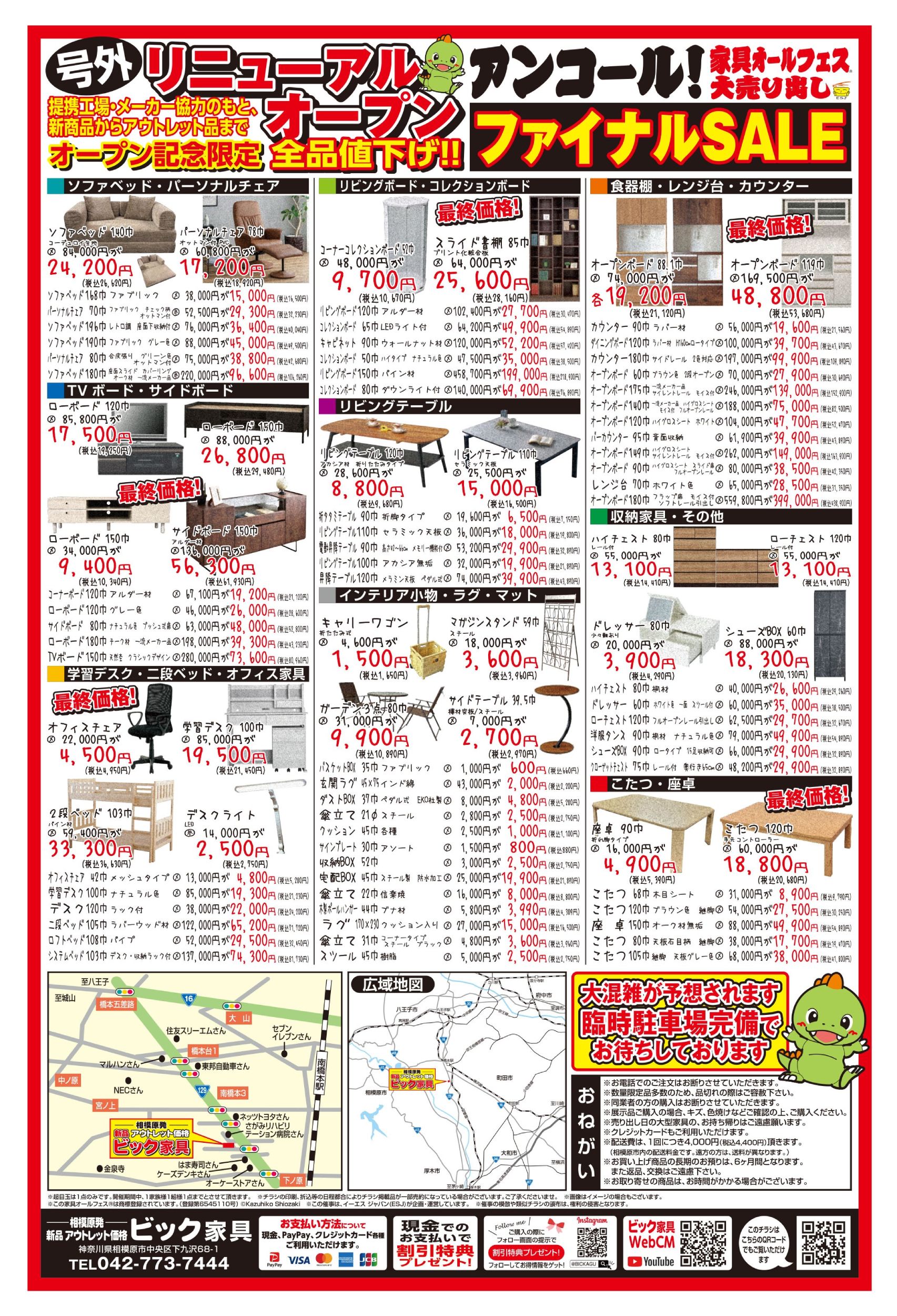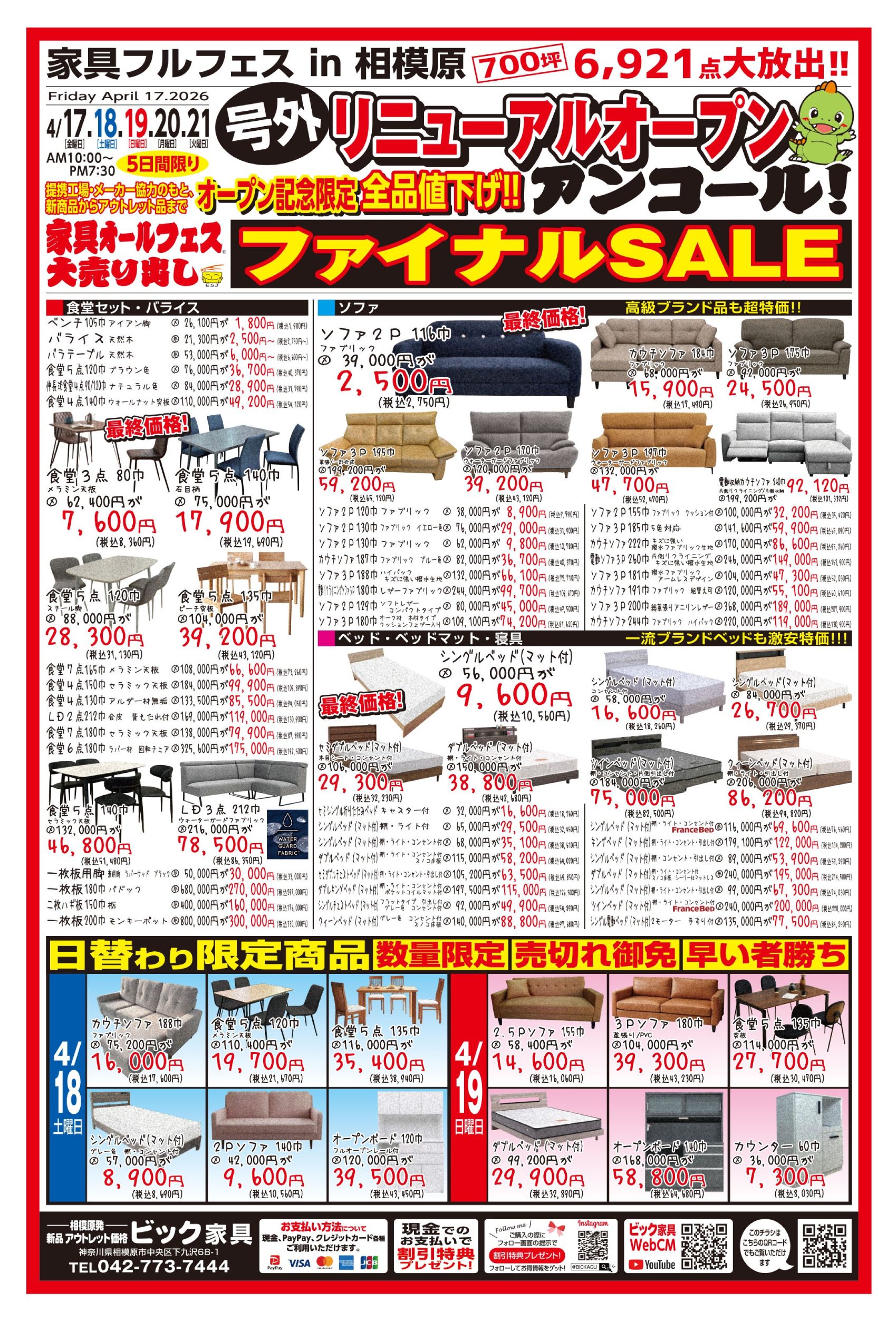 相模原(中央区) アウトレット アウトレット家具専門店 ビック家具 相模原市にある500坪の広い店内にはアウトレット家具がぎっしり! 1年保障付!! ピックアップニュース ネットチラシ もっと写真を見る ネットチラシ 広告有効期限:2026.04.17~2026.04.21 その他のネットチラシ 周辺のチラシを見る 周辺情報 グルメ ショッピング 車・バイク 住宅 暮らし 趣味・レジャー 美容・健康 SpirituS(スピリタス) 25.48 km ルートを確認する このお店のTOPページへ 042-773-7444 twitter Facebook Google+