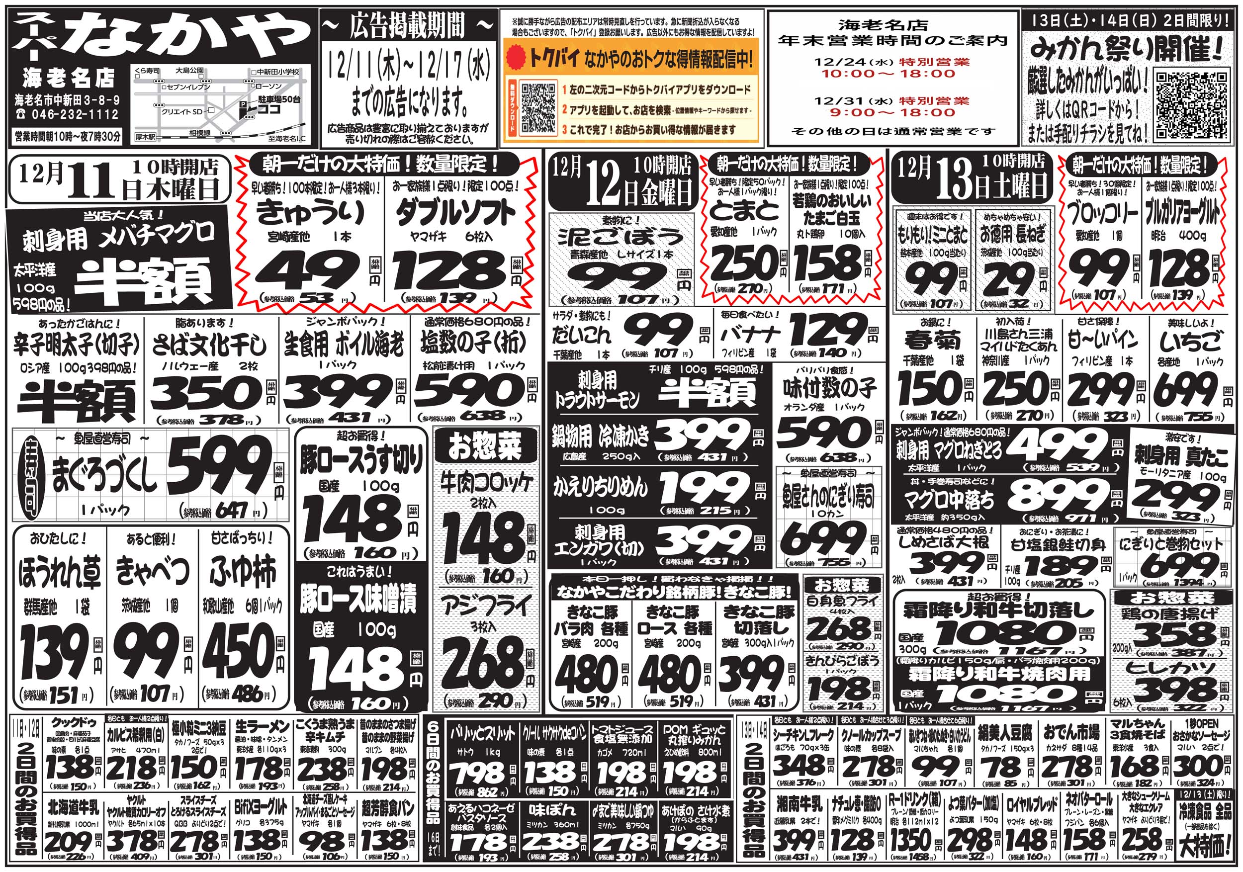 海老名市 スーパーなかや 海老名店 お客様の冷蔵庫がわりにご利用下さい。お買い得商品は折込チラシでチェック! なかやカード会員大募集 ネットチラシ クチコミを見る・投稿する ネットチラシ 広告有効期限:2025.12.11~2025.12.17 その他のネットチラシ 周辺のチラシを見る 周辺情報 グルメ ショッピング 車・バイク 住宅 暮らし 趣味・レジャー 美容・健康 SpirituS(スピリタス) 22.27 km ルートを確認する このお店のTOPページへ 046-232-1112 twitter Facebook Google+
