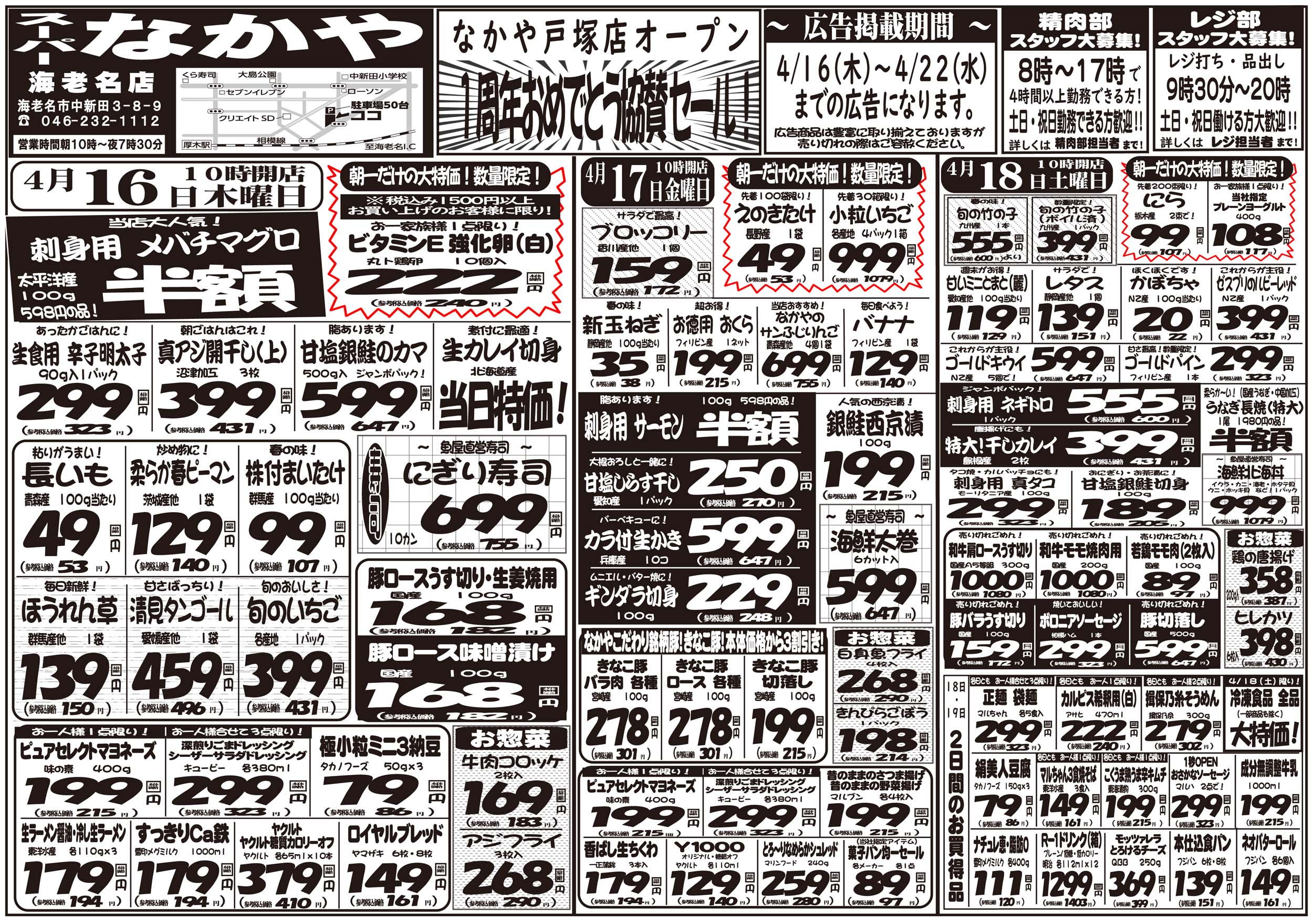 海老名市 スーパーなかや 海老名店 お客様の冷蔵庫がわりにご利用下さい。お買い得商品は折込チラシでチェック! なかやカード会員大募集 ネットチラシ クチコミを見る・投稿する ネットチラシ 広告有効期限:2026.04.16~2026.04.22 その他のネットチラシ 周辺のチラシを見る 周辺情報 グルメ ショッピング 車・バイク 住宅 暮らし 趣味・レジャー 美容・健康 SpirituS(スピリタス) 22.27 km ルートを確認する このお店のTOPページへ 046-232-1112 twitter Facebook Google+