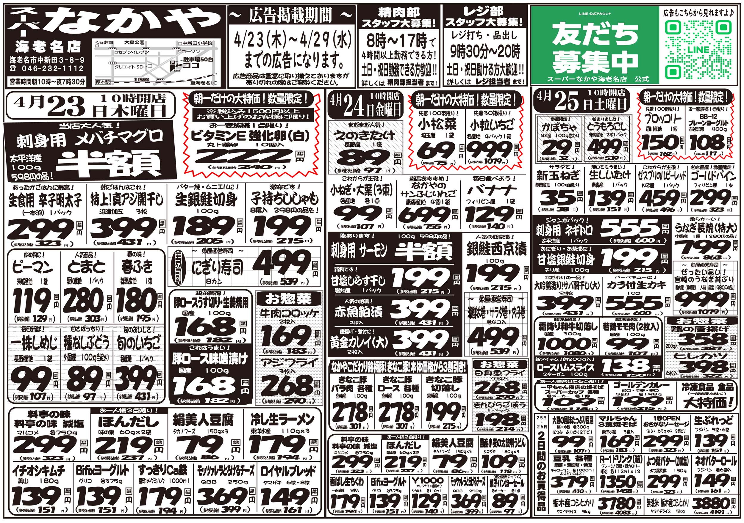 海老名市 スーパーなかや 海老名店 お客様の冷蔵庫がわりにご利用下さい。お買い得商品は折込チラシでチェック! なかやカード会員大募集 ネットチラシ クチコミを見る・投稿する ネットチラシ 広告有効期限:2026.04.23~2026.04.29 その他のネットチラシ 周辺のチラシを見る 周辺情報 グルメ ショッピング 車・バイク 住宅 暮らし 趣味・レジャー 美容・健康 SpirituS(スピリタス) 22.27 km ルートを確認する このお店のTOPページへ 046-232-1112 twitter Facebook Google+