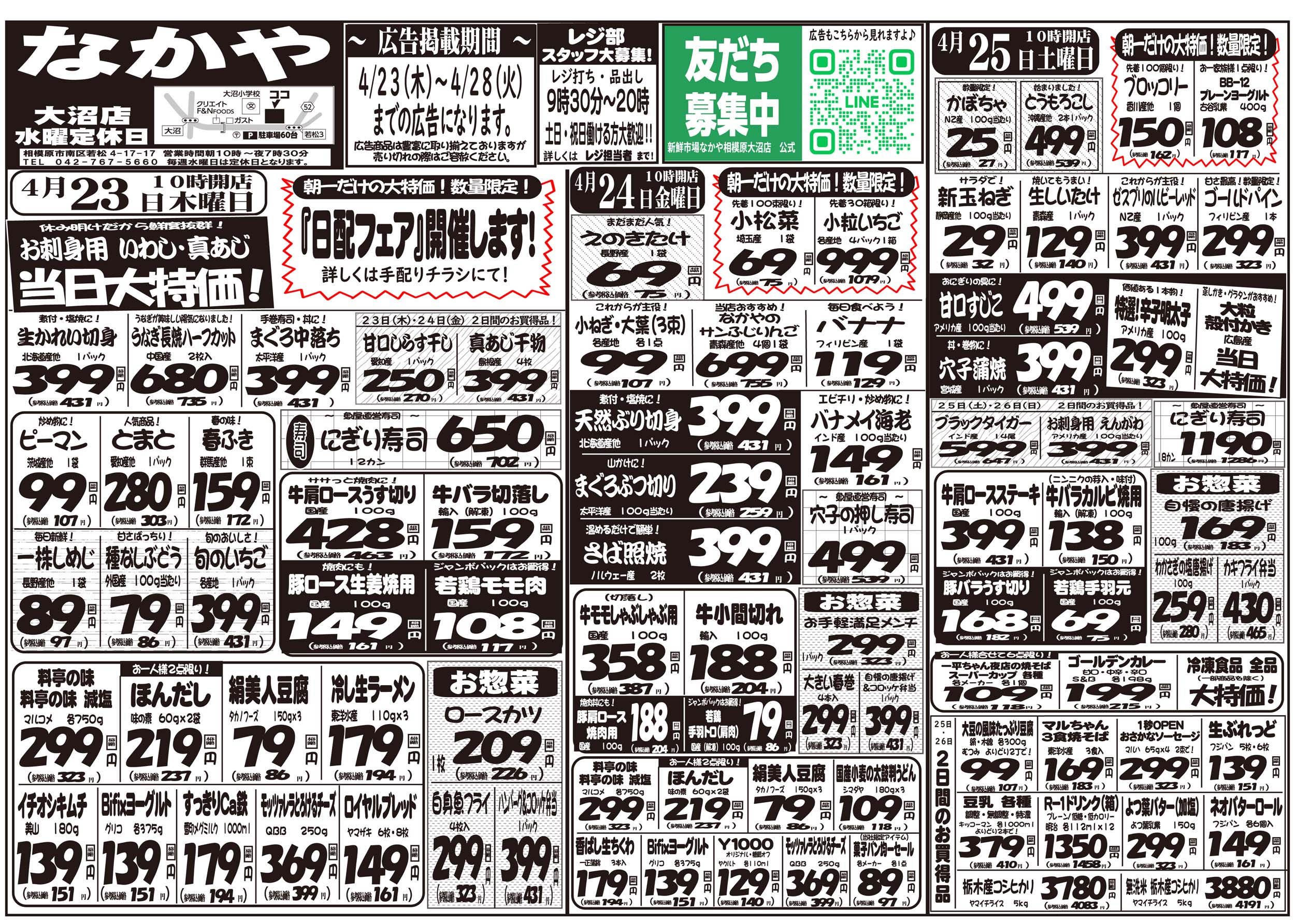 相模原(南区) 新鮮市場 なかや 大沼店 お客様の冷蔵庫がわりにご利用下さい。お買い得商品は折込チラシでチェック! ネットチラシ クチコミを見る・投稿する ネットチラシ 広告有効期限:2026.04.23~2026.04.28 その他のネットチラシ 周辺のチラシを見る 周辺情報 グルメ ショッピング 車・バイク 住宅 暮らし 趣味・レジャー 美容・健康 SpirituS(スピリタス) 29.85 km ルートを確認する このお店のTOPページへ 042-767-5660 twitter Facebook Google+