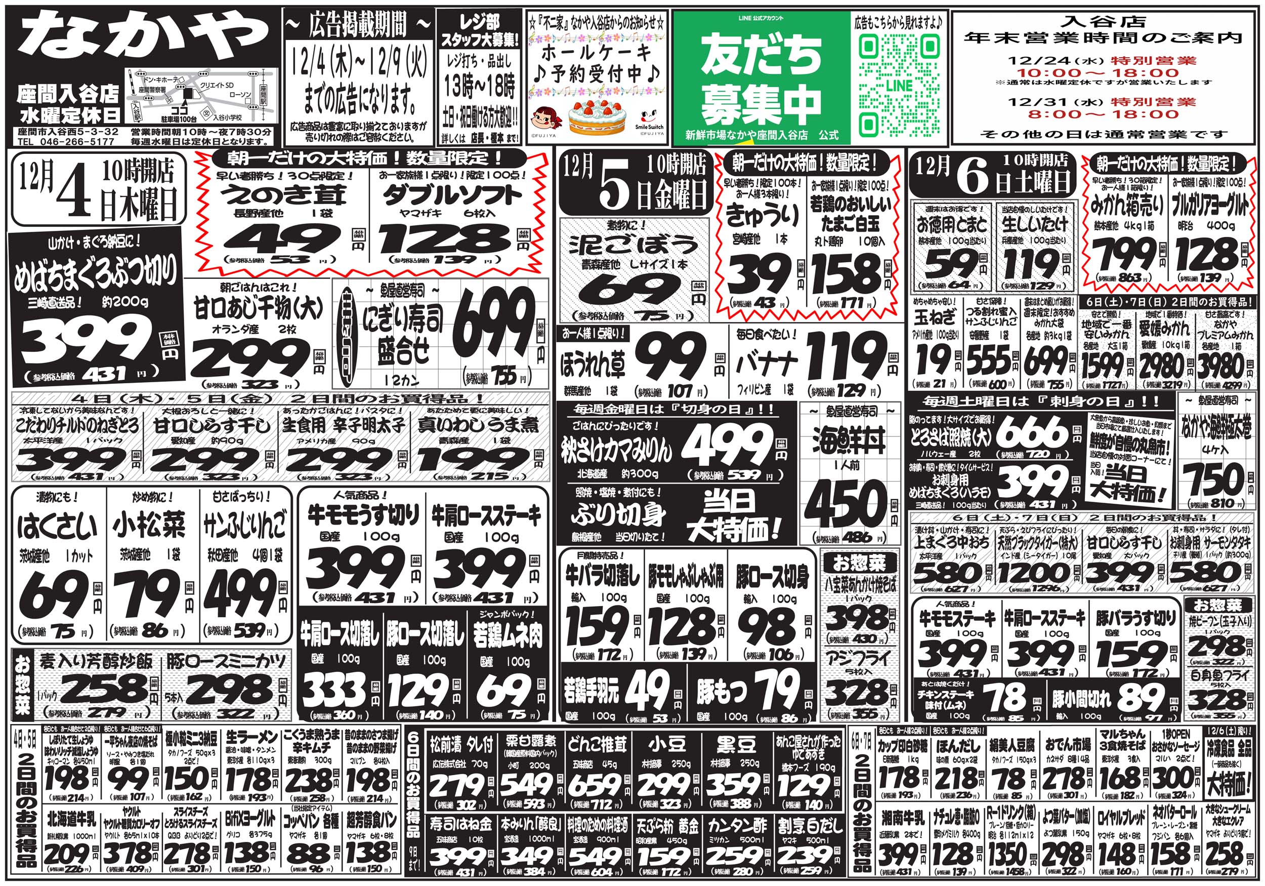 座間市 新鮮市場 なかや 座間入谷店 お客様の冷蔵庫がわりにご利用下さい。お買い得商品は折込チラシでチェック! ネットチラシ クチコミを見る・投稿する ネットチラシ 広告有効期限:2025.12.04~2025.12.09 その他のネットチラシ 周辺のチラシを見る 周辺情報 グルメ ショッピング 車・バイク 住宅 暮らし 趣味・レジャー 美容・健康 SpirituS(スピリタス) 25.06 km ルートを確認する このお店のTOPページへ 046-266-5177 twitter Facebook Google+