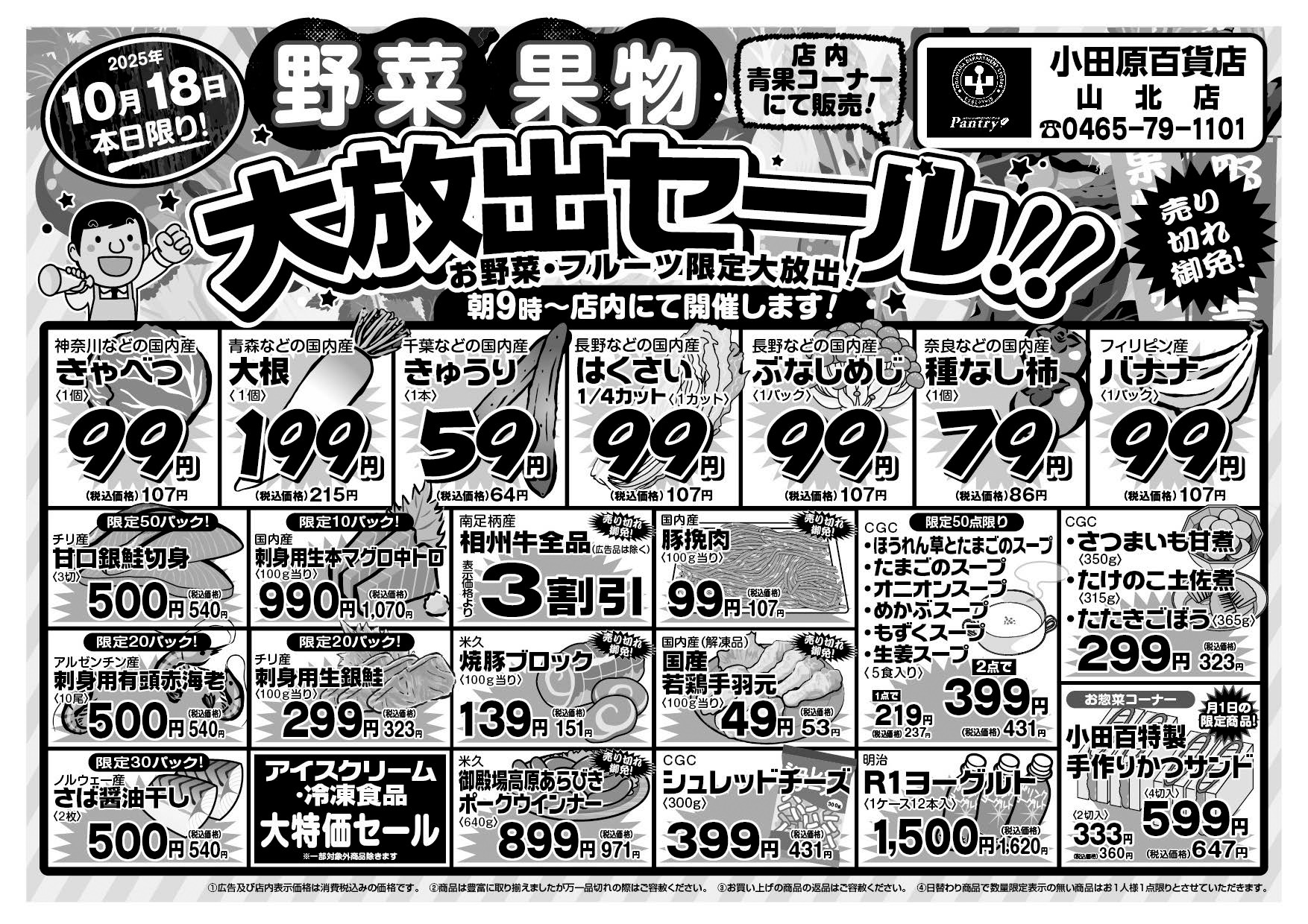 山北町 小田原百貨店 山北店 地元名産の野菜、新鮮な商品を取り揃えております。 ネットチラシ クチコミを見る・投稿する ネットチラシ 広告有効期限:2025.10.18~2025.10.19 その他のネットチラシ 広告有効期限 2025/10/13~2025/10/19 周辺のチラシを見る 周辺情報 グルメ ショッピング 車・バイク 住宅 暮らし 趣味・レジャー 美容・健康 SpirituS(スピリタス) 9.37 km ルートを確認する このお店のTOPページへ 0465-79-1101 twitter Facebook Google+
