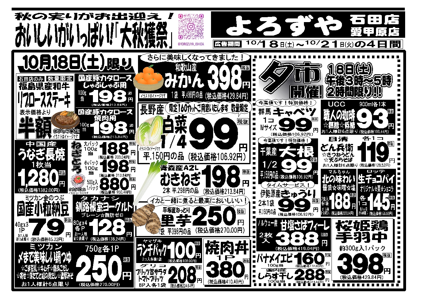伊勢原市 よろずや 愛甲原店 愛甲石田駅 高森台 お買い得 スーパー ピックアップニュース ネットチラシ ネットチラシ 広告有効期限:2025.10.18~2025.10.21 その他のネットチラシ 周辺のチラシを見る 周辺情報 グルメ ショッピング 車・バイク 住宅 暮らし 趣味・レジャー 美容・健康 SpirituS(スピリタス) 16.67 km ルートを確認する このお店のTOPページへ 0463-93-0001 twitter Facebook Google+