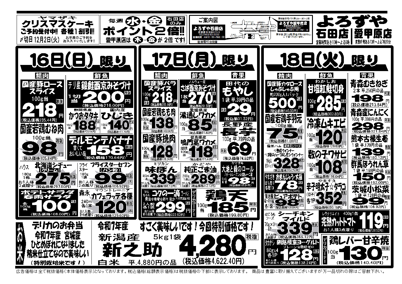 伊勢原市 よろずや 石田店 愛甲石田駅より徒歩3分の地域密着型のスーパー。 ネットチラシ クチコミを見る・投稿する ネットチラシ 広告有効期限:2025.11.15~2025.11.18 その他のネットチラシ 周辺のチラシを見る 周辺情報 グルメ ショッピング 車・バイク 住宅 暮らし 趣味・レジャー 美容・健康 SpirituS(スピリタス) 17.71 km ルートを確認する このお店のTOPページへ 0463-93-3333 twitter Facebook Google+