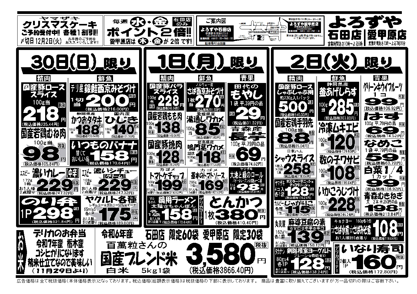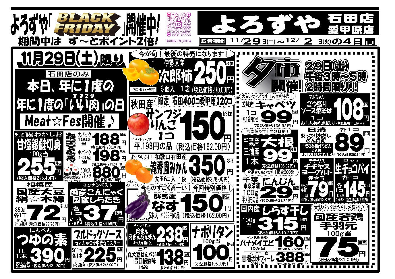 伊勢原市 よろずや 石田店 愛甲石田駅より徒歩3分の地域密着型のスーパー。 ネットチラシ クチコミを見る・投稿する ネットチラシ 広告有効期限:2025.11.29~2025.12.02 その他のネットチラシ 周辺のチラシを見る 周辺情報 グルメ ショッピング 車・バイク 住宅 暮らし 趣味・レジャー 美容・健康 SpirituS(スピリタス) 17.71 km ルートを確認する このお店のTOPページへ 0463-93-3333 twitter Facebook Google+